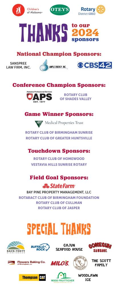Rotary International District 6860 would like to thank the community for their support in raising funds for the Critical Care Transport (CCT) team at Children’s of Alabama.